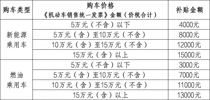 細(xì)則規(guī)定,消費(fèi)者轉(zhuǎn)讓的舊車(chē)應(yīng)于2025年1月8日前登記在申請(qǐng)人名下。在購(gòu)買(mǎi)新車(chē)時(shí),按照《機(jī)動(dòng)車(chē)銷(xiāo)售統(tǒng)一發(fā)票》金額(價(jià)稅合計(jì)),置換車(chē)輛為新能源乘用車(chē)新車(chē)的:5萬(wàn)元(不含)以下每輛補(bǔ)貼4000元;5(含)-10萬(wàn)元(不含)補(bǔ)貼8000元;10(含)-15萬(wàn)元(不含)補(bǔ)貼12000元;15萬(wàn)元(含)以上補(bǔ)貼15000元。如置換燃油乘用車(chē):5萬(wàn)元(不含)以下補(bǔ)貼3000元;5(含)-10萬(wàn)元(不含)補(bǔ)貼7000元;10(含)-15萬(wàn)元(不含)補(bǔ)貼 11000元;15萬(wàn)元(含)以上補(bǔ)貼13000元。補(bǔ)貼資金用完活動(dòng)即止。