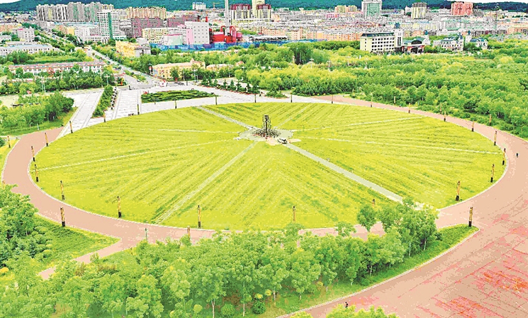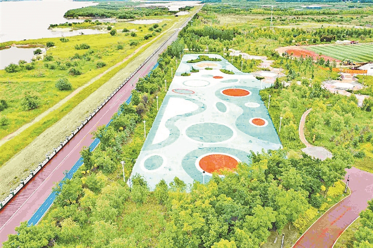 距離體育場不遠,有一處數(shù)千平方米的休閑廣場。廣場周邊新鋪了多條紅色慢行步道,是市民們散步休閑的好去處。在中心區(qū)域,工人們正建設雕塑,為中外游客打造一處美麗的打卡點。