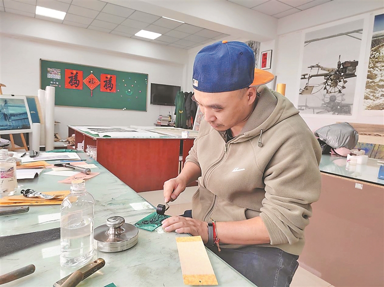 慶安版畫是黑龍江省非物質(zhì)文化遺產(chǎn)代表性項(xiàng)目,始于20世紀(jì)初。創(chuàng)始人吳盡臣將河北樂亭的木刻技藝帶到這片黑土地,最初以雕刻門神、福字等民俗圖案為主題,突出節(jié)日的喜慶和吉祥氣氛,表達(dá)人們對(duì)美好未來的企盼和追求。20世紀(jì)60年代中期,幾位著名的北大荒畫家到慶安工作,精心指導(dǎo)民俗年畫作者創(chuàng)作版畫,將慶安民俗版畫和北大荒版畫創(chuàng)作相互交融。歷經(jīng)四代傳承,吳蔚的父親吳玉林將題材拓展,用細(xì)膩刀法展現(xiàn)慶安的春播秋收、田園生活,在傳承中不斷創(chuàng)新;而吳蔚則把冰雪元素融入版畫創(chuàng)作,將千里冰封的壯美轉(zhuǎn)化為木板上的立體紋理?!袄献孀诹粝碌募妓嚥荒軄G,但作品題材和技法也要與時(shí)俱進(jìn),推陳出新?!眳俏当硎?,他們的創(chuàng)作團(tuán)隊(duì)不僅深入田間地頭、林海雪原采風(fēng),用刻刀記錄黑土地的獨(dú)特風(fēng)情,也緊盯時(shí)事熱點(diǎn),呈現(xiàn)新時(shí)代的主流價(jià)值。