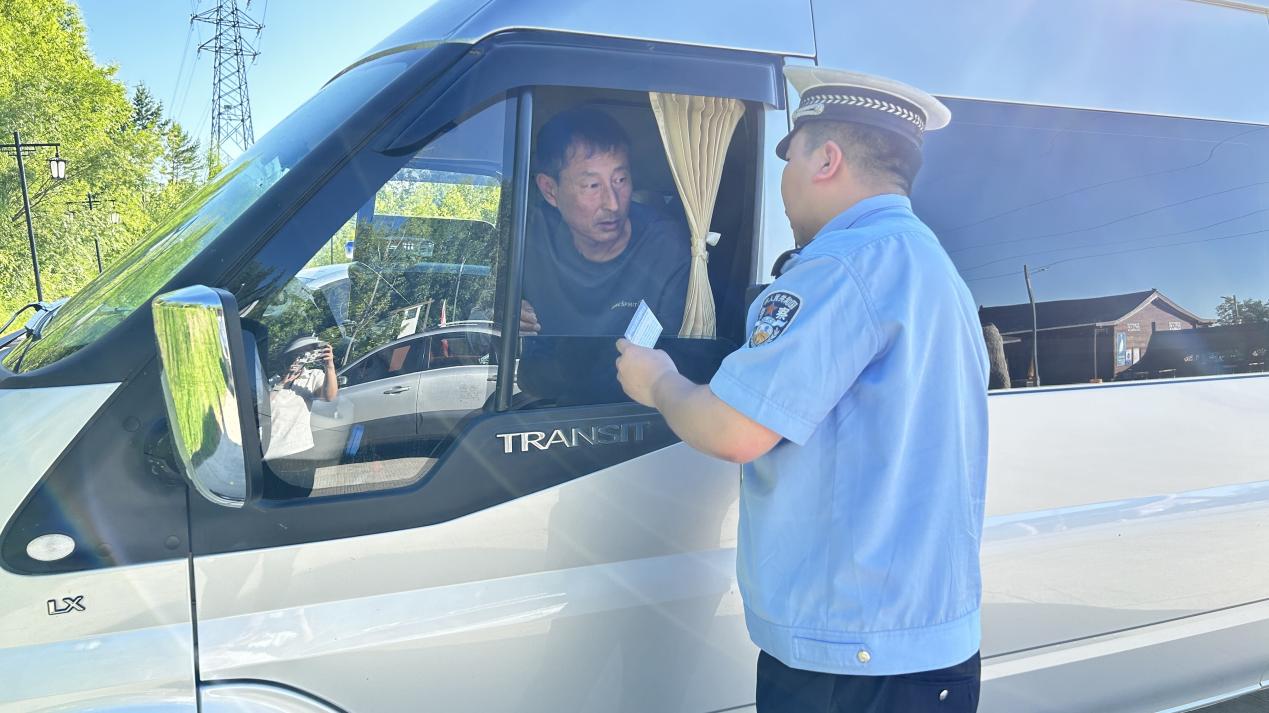 發(fā)放護(hù)游聯(lián)系卡時,民警耐心地向駕駛車輛的游客介紹卡片的功能。為切實提升來呼瑪游客的體驗感和滿意度,強化“護(hù)游”服務(wù),讓這張小小的卡片在警民之間搭起一座便捷暖心的溝通橋梁。
