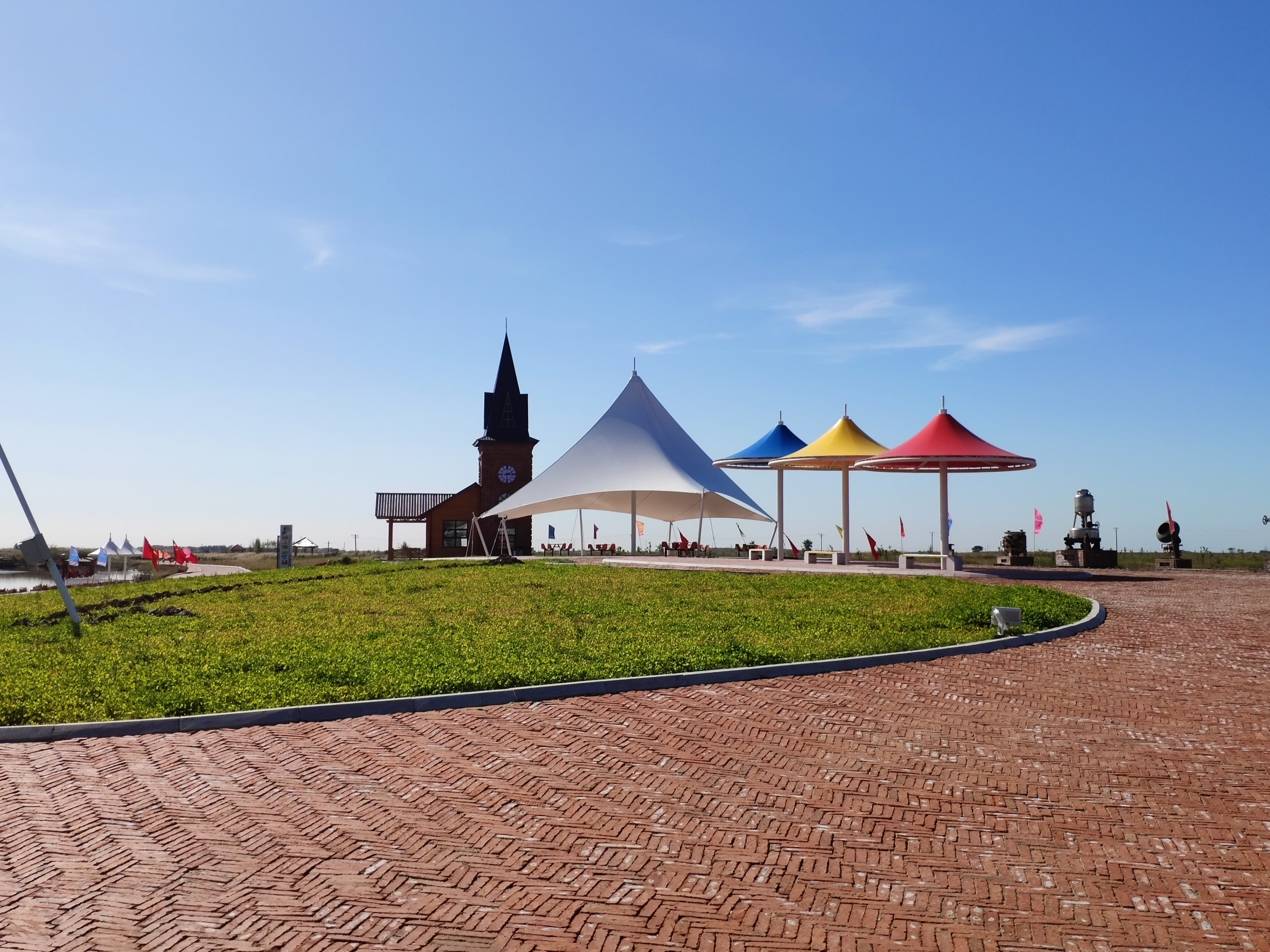 傳統(tǒng)文化廣場以金代文化為主題,廣場中央矗立著仿古城墻雕塑,兩側設有民俗展覽館,仿古建筑群與小橋流水相映成趣。休閑廣場以現代簡約風格設計,配備智能健身器材和兒童游樂區(qū),設有秋千群、帳篷營地,家庭游客可在此野餐、嬉戲。而在位于濕地制高點的觀景廣場,可俯瞰湖光山色。夕陽西下時,霞光與候鳥齊飛,成為網紅打卡點。