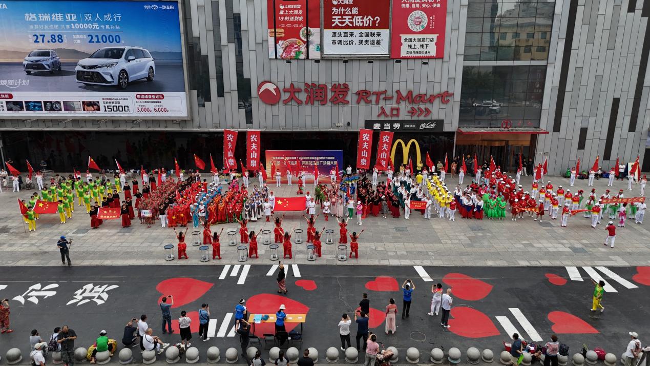 30人鼓樂(lè)團(tuán)方陣,精神飽滿閃亮登場(chǎng),瞬間點(diǎn)燃現(xiàn)場(chǎng)氣氛;隨后身穿紅色T恤的百人舞團(tuán),臺(tái)上臺(tái)下同跳《丁香花》,優(yōu)美舞姿展現(xiàn)出濃郁地域文化特色……