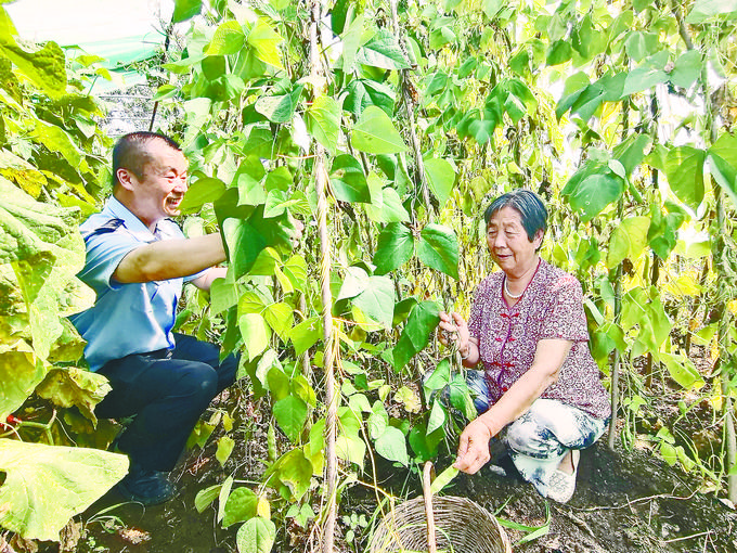 七月八日,駐東興村工作隊(duì)民警張福濱幫助村民在大棚摘豆角。王銳攝