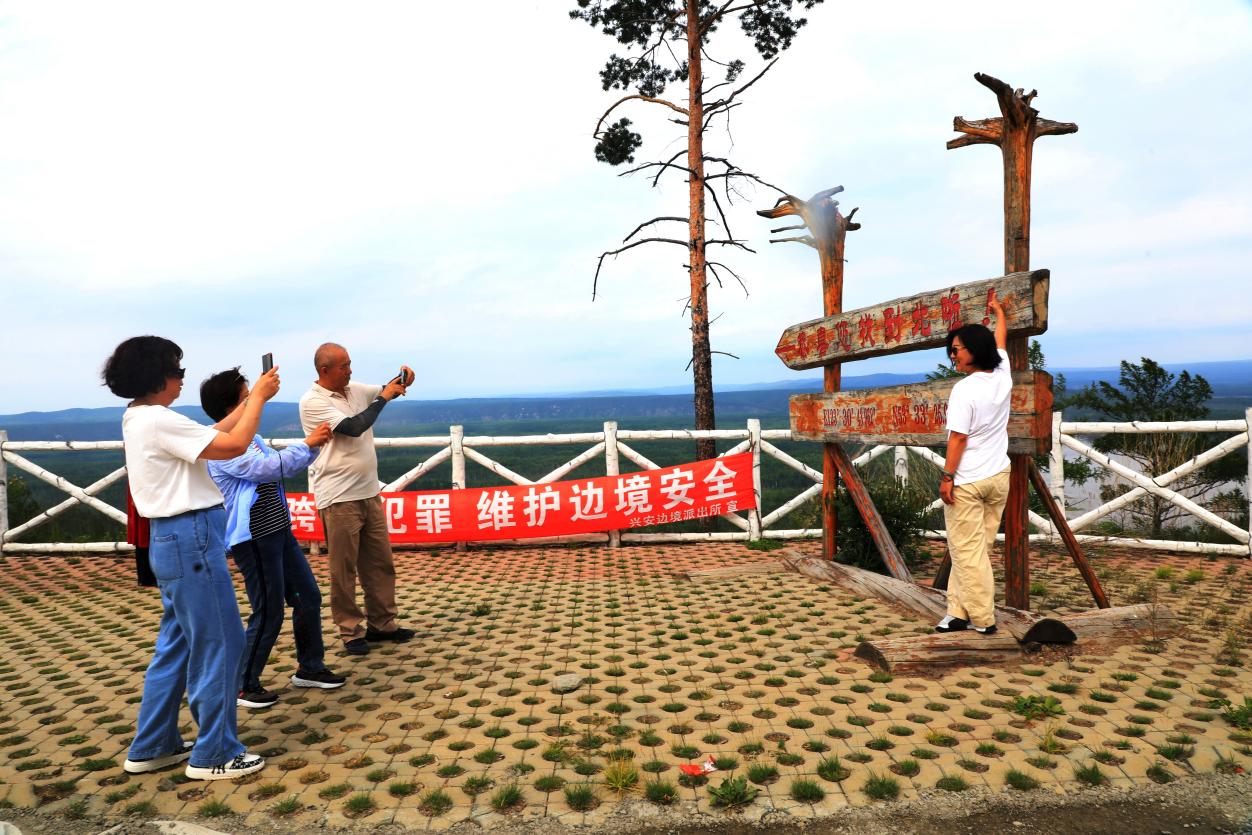 來(lái)自大慶市的游客走進(jìn)阿木爾林業(yè)局地標(biāo)性建筑,為開(kāi)始北緯53度之旅興奮之情溢于言表(王力 攝)