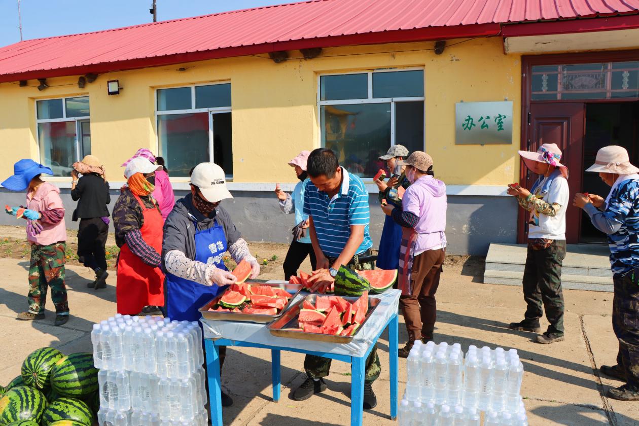 新林林業(yè)局黨委委員、工會主席周成仁為職工送上西瓜(冀威威 攝)