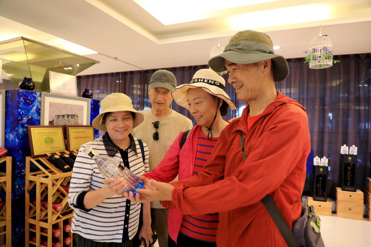 《情系阿木爾》作者錢國良(右一)和老知青妻子劉洪建(右二),實(shí)地參觀北極冰藍(lán)莓酒莊,并對產(chǎn)品產(chǎn)生了濃厚興趣(王力 攝)