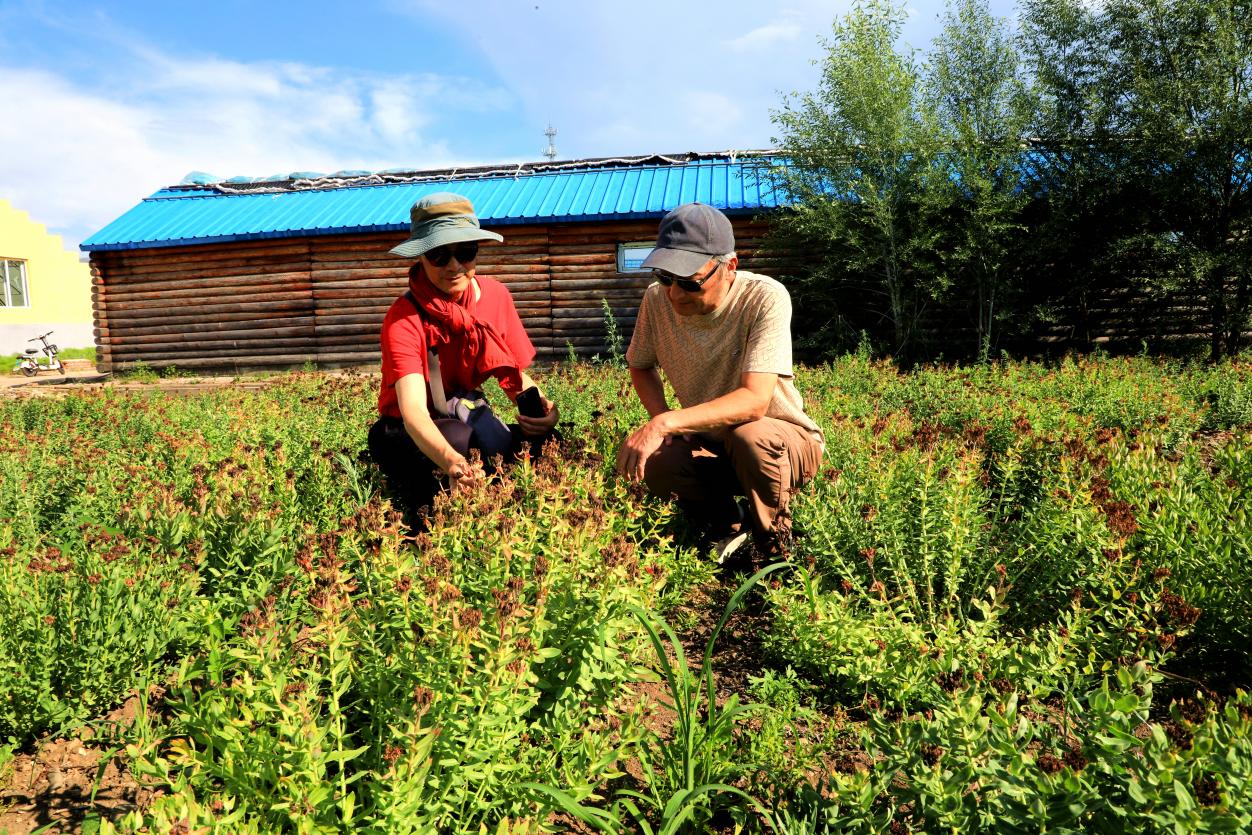 《情系阿木爾》作者錢國良(左)和一路同行的杭州游客孫華憲(右),對林業(yè)局培育的高山紅景天贊不絕口(王力 攝)