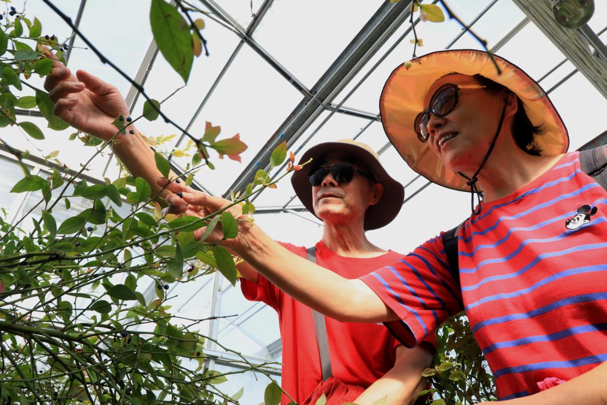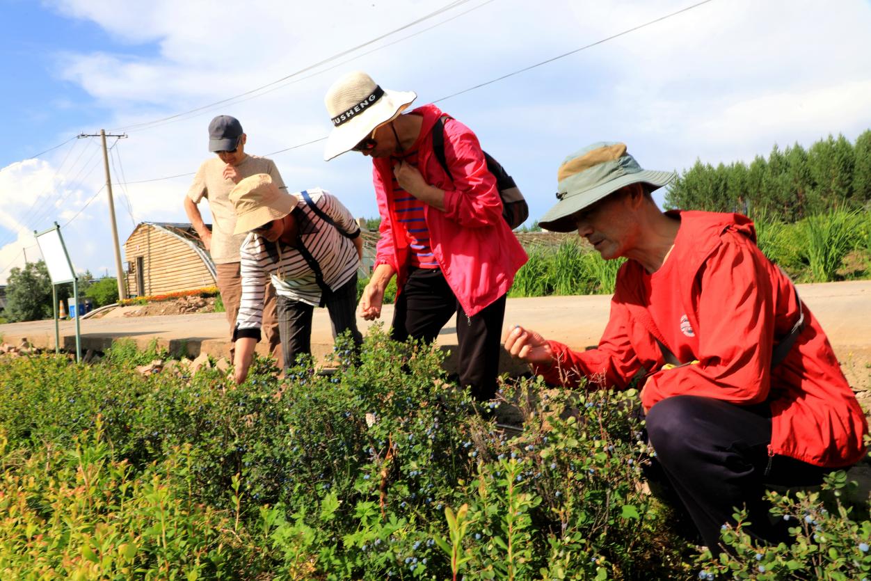 《情系阿木爾》作者錢國良夫婦和一路同行的杭州游客孫華憲夫婦,被藍(lán)莓園培育的美登藍(lán)莓吸引了眼球(王力 攝)