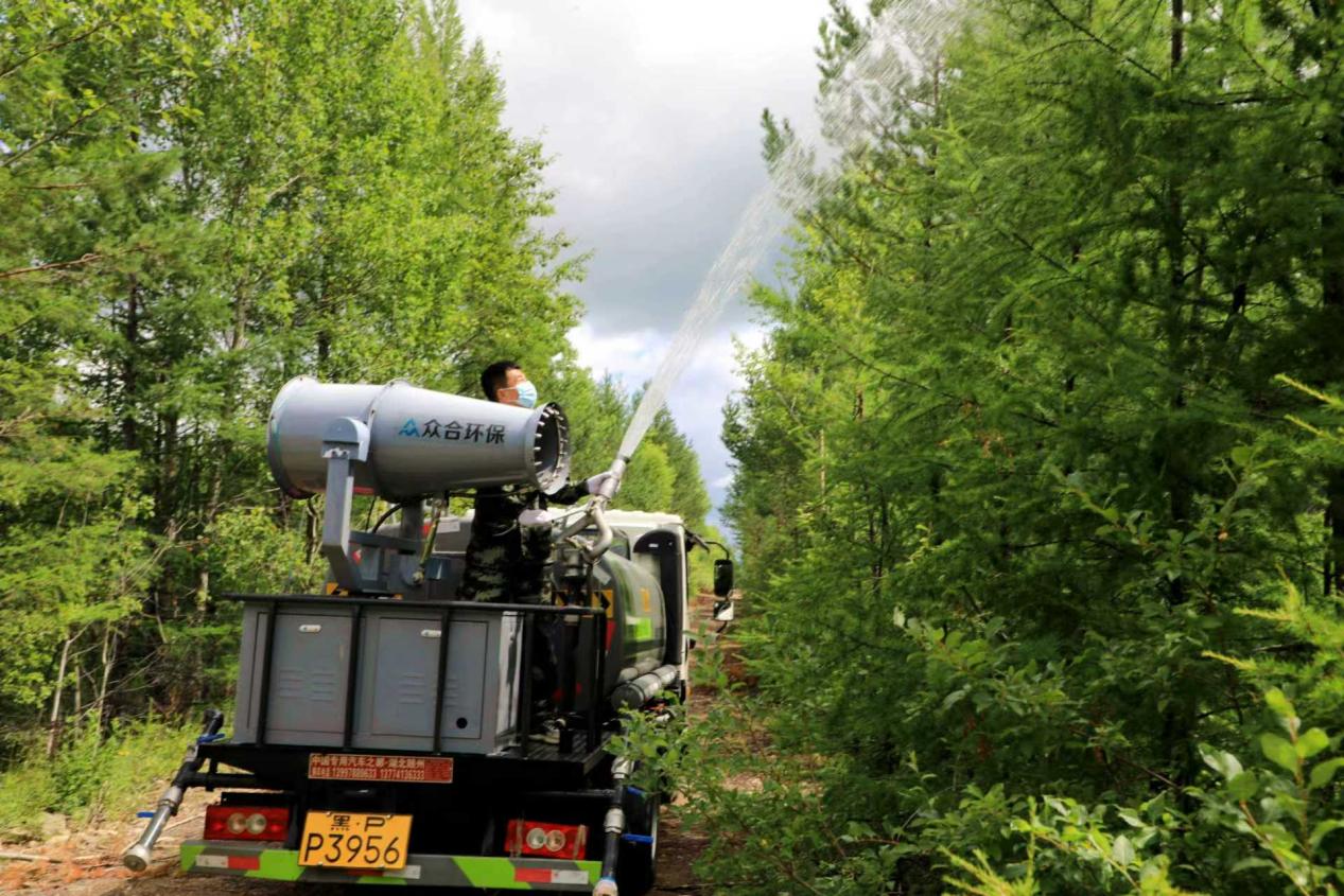 阿木爾林業(yè)局防治站工作人員利用高效噴霧車,模擬防治松樹鉆蛀類害蟲災(zāi)害(王力 攝)
