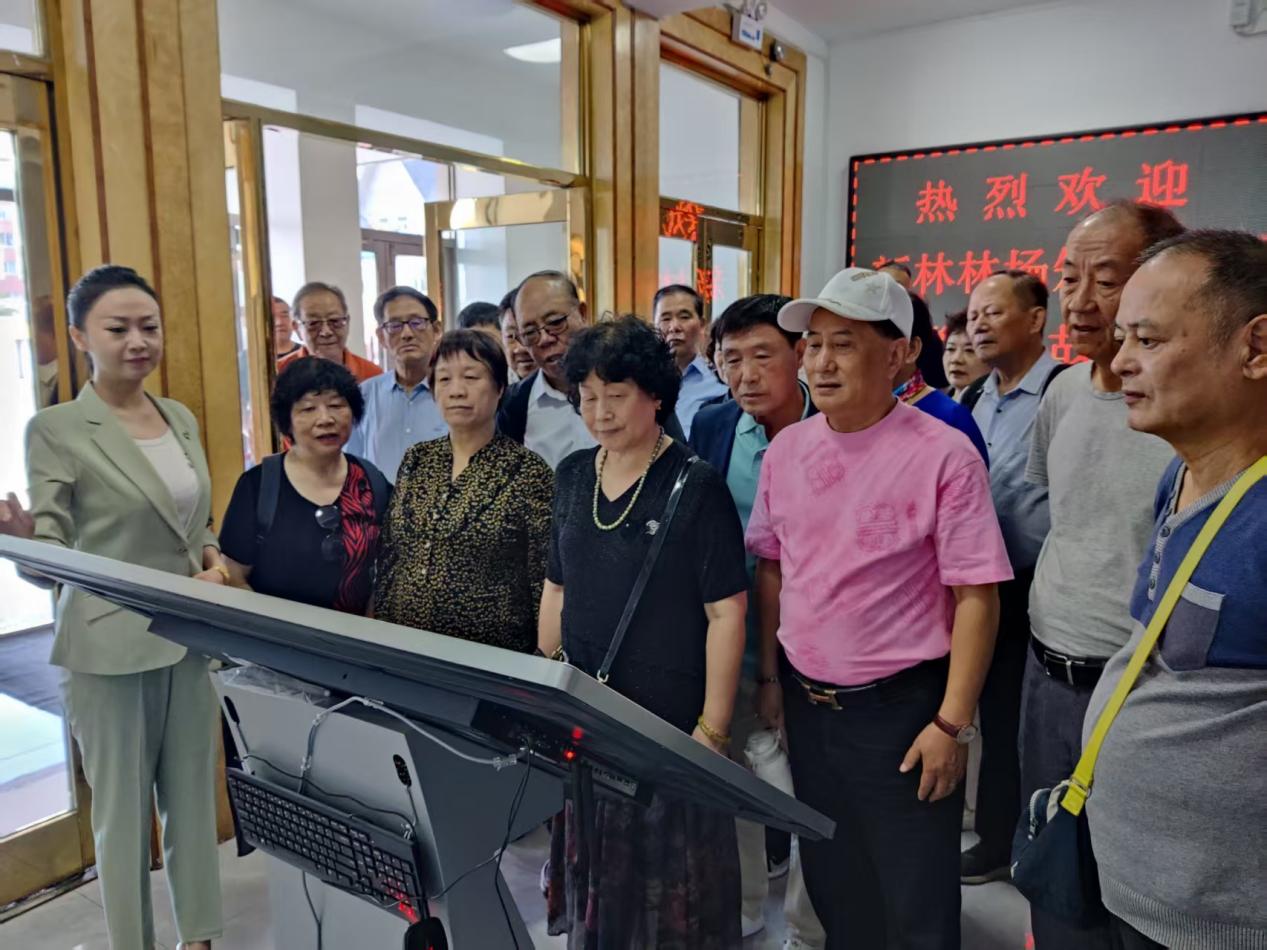 新林林場講解員給老知青們介紹多媒體觸控一體機的功能和作用(郭仁峰 攝)