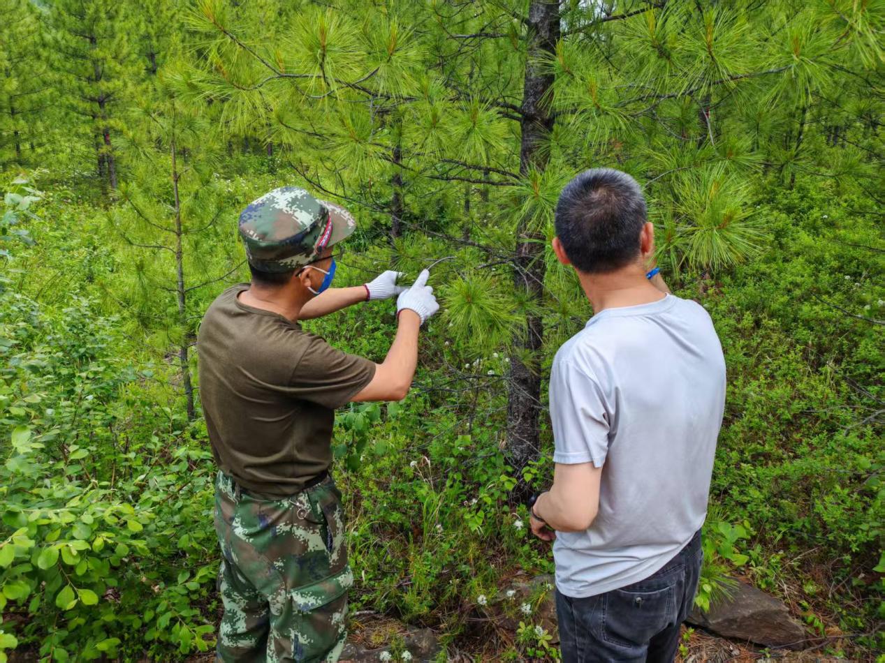 林業(yè)局技術(shù)人員在進行蟲害調(diào)查(王微 攝)