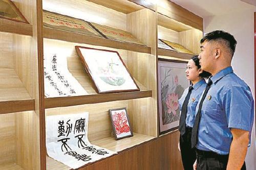 9月8日,黑龍江省牡丹江市東安區(qū)檢察院青年干警駐足觀看廉潔書(shū)畫(huà)作品