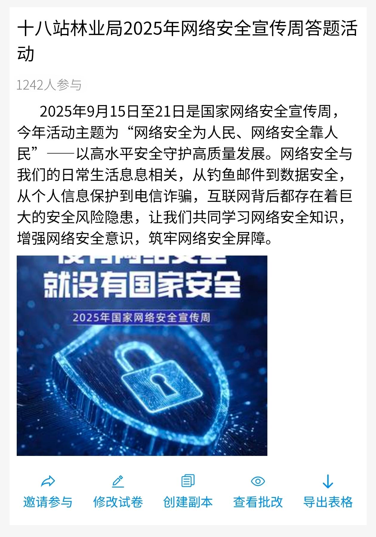 為進(jìn)一步擴(kuò)大宣傳覆蓋面,在公眾號上推出“網(wǎng)絡(luò)安全知識有獎答題”活動,涵蓋了《網(wǎng)絡(luò)安全法》《個人信息保護(hù)法》、密碼安全、辦公環(huán)境安全等多個方面,在互動中深化了對網(wǎng)絡(luò)安全知識的理解與掌握,形成了線上線下協(xié)同推進(jìn)的宣傳合力。