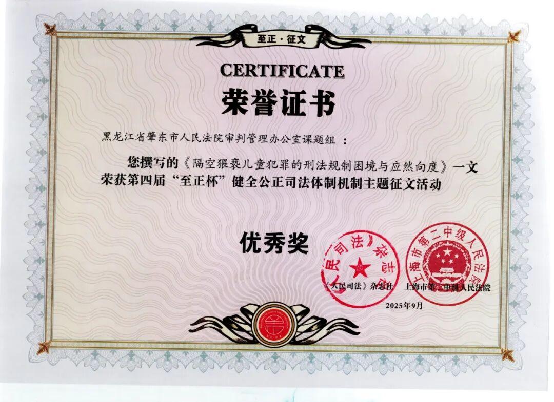 黑龍江經(jīng)濟(jì)網(wǎng)訊(董慧瑩 王岳)近日,由《人民司法》雜志社與上海市第二中級人民法院聯(lián)合舉辦的第四屆“至正杯”健全公正司法體制機(jī)制征文活動(dòng)結(jié)果揭曉。本屆征文共收到投稿1500余篇,經(jīng)評委會(huì)認(rèn)真評議,共評選出一等獎(jiǎng)5篇、二等獎(jiǎng)15篇、三等獎(jiǎng)50篇、優(yōu)秀獎(jiǎng)60篇。其中,肇東市人民法院審管辦(研究室)課題組撰寫的調(diào)研論文《隔空猥褻兒童犯罪的刑法規(guī)制困境與應(yīng)然向度》榮獲優(yōu)秀獎(jiǎng)。