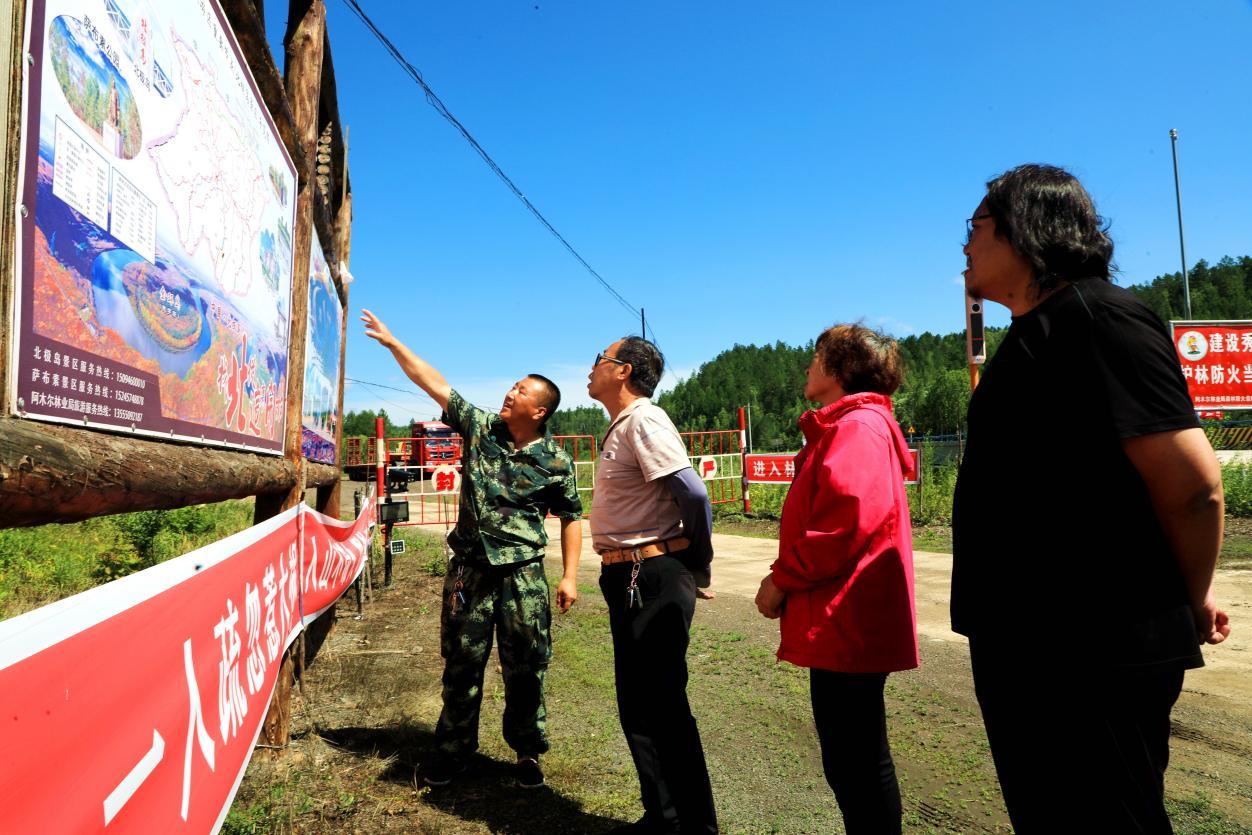 阿木爾林業(yè)局1—21線管護(hù)員李瑞向游客介紹旅游景點(diǎn)(王力 攝)