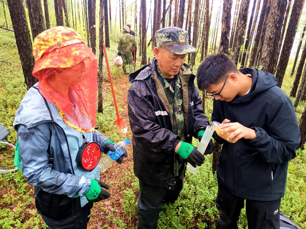 東北林業(yè)大學(xué)鄒莉教授(左)查看長山林場野生松茸生長情況(王力 攝)