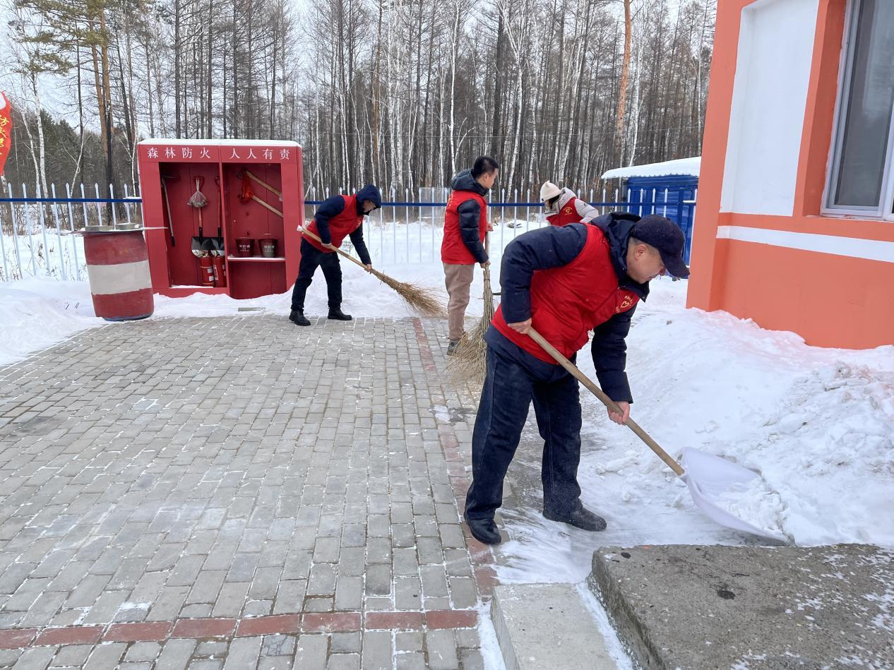 在清掃現(xiàn)場,服務(wù)隊隊長現(xiàn)場分工,志愿者們手持鐵鍬、雪推等工具,重點清理主干道與作業(yè)通道。大家配合默契,鏟雪、推雪、掃雪有序進行。盡管天氣寒冷,但志愿者們干勁十足。經(jīng)過連續(xù)奮戰(zhàn),各管護站的主要道路、院落和通道積雪被徹底清除,出行安全得到保障。